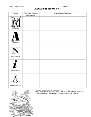 MANIA Jigsaw WWI Activity MANIA: There are five causes that led to war between the major powers of the world in 1914: Militarism, Alliances, Imperialism, Nationalism, and Assassination.. DIRECTIONS. Read the main cause you have been assigned. In your group answer the questions. After you complete the first part, you will "jigsaw" with your classmates by presenting your findings to the class.