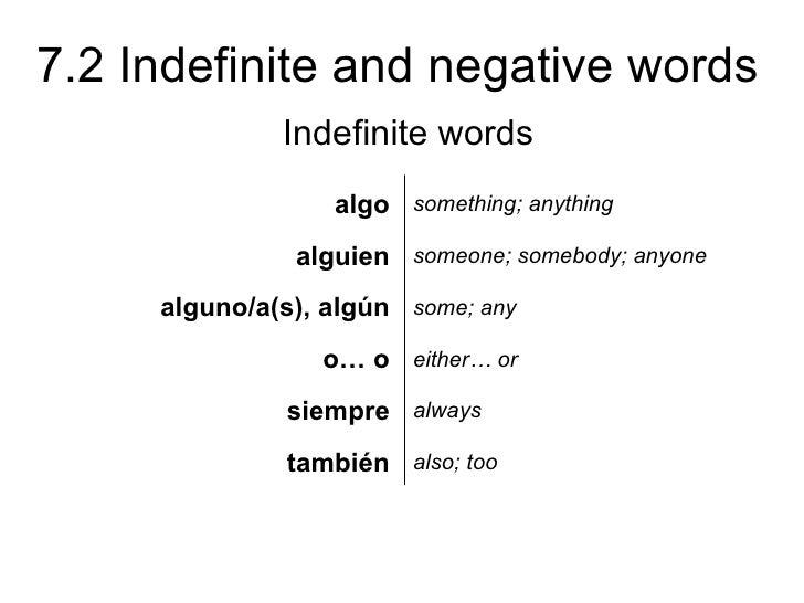 Spanish Indefinite and Negative Word Practice Práctica de indefinidos y negativos en español. Spanish indefinite and negative words (something, nothing, neither, etc.) have many parallels in English, but there are some important differences. The most salient is that negatives do not cancel each other. In Spanish it is perfectly normal to say ...
