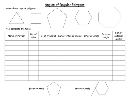 27 Nov 2014 — These 2 tutorials and 2 worksheets can be used to develop formulae that connect the number of sides, interior angle and exterior angle of a ... Rating: 4.7 · 74 reviews · Free · In stock