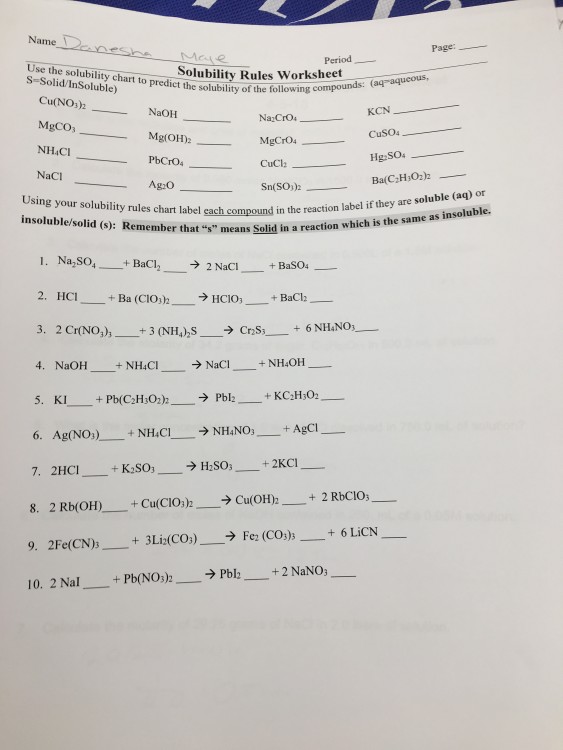 View full document. Name: ___________________________ Date: __________ Period: ______ Solubility Rules Practice Worksheet 1. Name or give the chemical formula for each of the following compounds. 2. State whether they are soluble (will dissolve) or insoluble (will not dissolve) in solution. Use solubility rules.