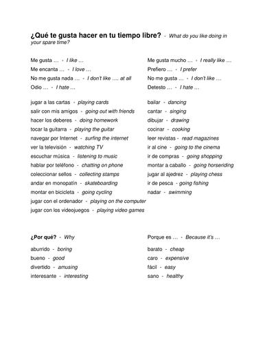 Live worksheets > Spanish. Que te gusta hacer -parter activity. Partner activity where the partners ask each other what they like to do and then record the answers. ID: 1946428. Language: Spanish. School subject: Spanish 2. Grade/level: Grade 10. Age: 13-18.