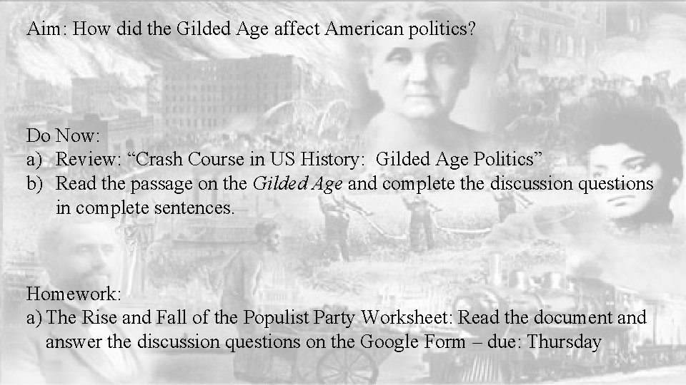 Politics of the Gilded Age PPT - APUSH New Framework - Period 6. by. History is Old. 8. $5.00. PPTX. From: History is Old PowerPoint Presentation on the Politics of the United States during the Gilded Age (1877-1900). Covers the "forgettable presidents," bossism and political machines, and the Populist movement.