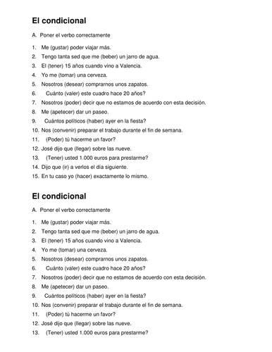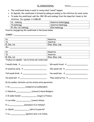 Nov 25, 2020 — ... worksheet with some conjugation and translation exercises to practise the conditional tense of regular verbs (plus hacer) in Spanish. Rating: 5 · 1 review · Free · In stock