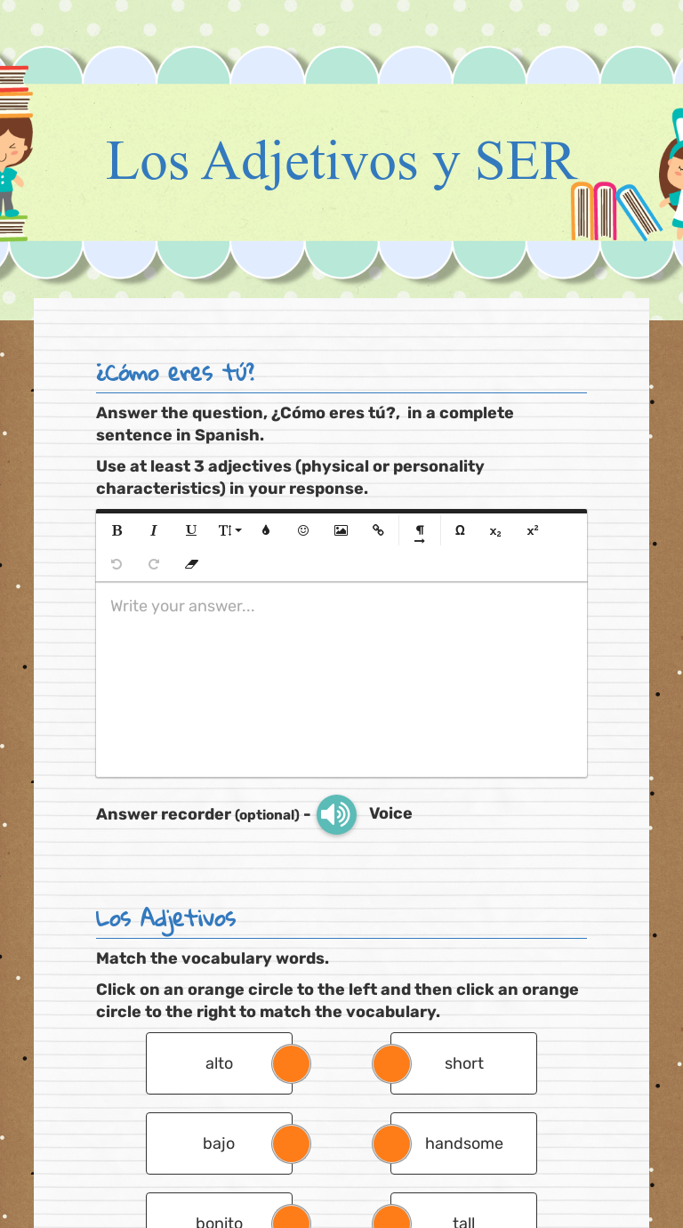 Description. With this worksheet, students will practice using los adjetivos descriptivos (descriptive adjectives). Students answer ten questions that test ...