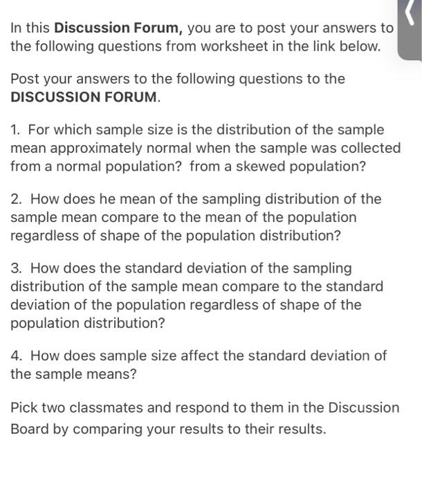 Answers 1. a) 4038 b) 5671 c) 49 2. As sample size increases, the distribution of data approaches normal distribution. 3. a) Yes b) No c) Yes 4. Normal Distribution 5. The distribution should look like a bell curve be because n is sufficiently large (n > 30). 6. The distribution would be approximately normal with the mean near the population ...