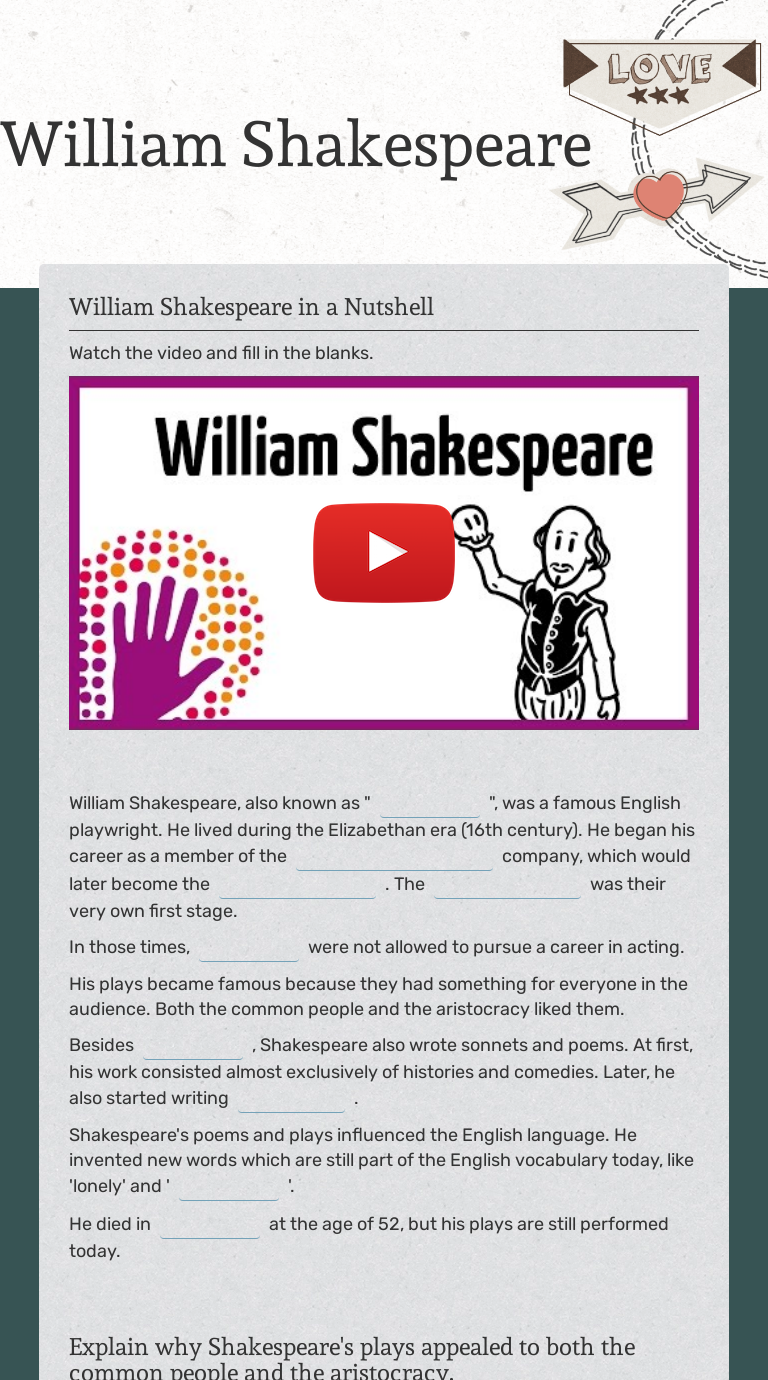 Shakespeare invented or at least wrote down a lot of words and phrases that are still used today. At Year 1 MasteryYear 2 SecureYear 3 Emerging. Ad The most comprehensive library of free printable worksheets digital games for kids. 1557 Williams parents John Shakespeare and Mary Arden were married.