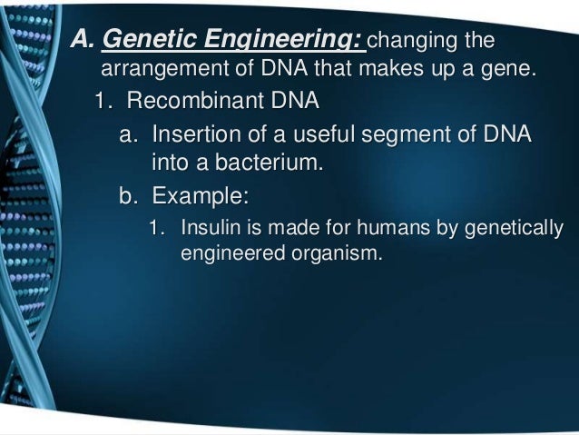 Advances in Genetics ... process in which genes from one organism are transferred into the DNA of ... What are the concerns about genetic engineering?