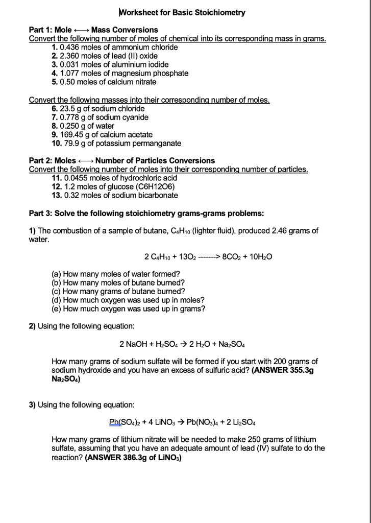 Chemistry stoichiometry worksheet 1 answers. Solve each of the following problems. Stoichiometry worksheet and key 1 65 mol kclo 3 mol kclo 3 mol o 2 molo 2 3 50mol kcl mol kclo 3 0 275 mol fe mol fe 2o 3 2 kclo 3 è 2 kcl 3 o 2 10. Mole mass conversions convert the following number of moles of chemical into its corresponding mass in grams.