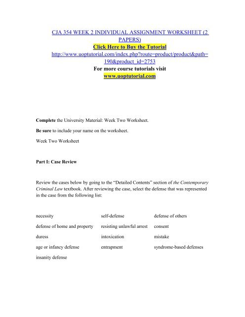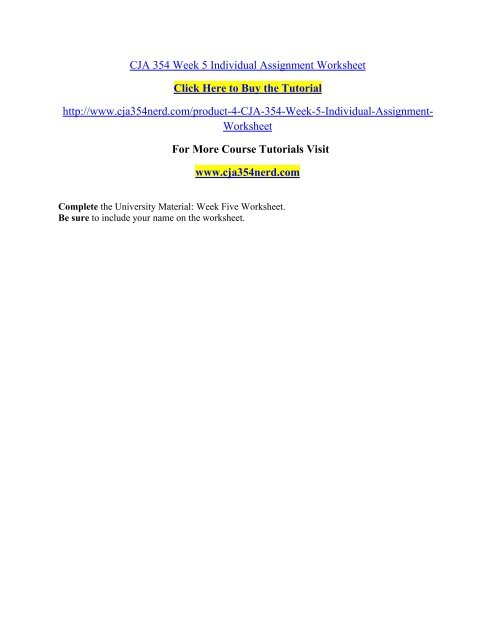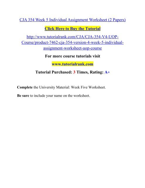 CJA 354 WEEK 5 INDIVIDUAL ASSIGNMENT WORKSHEET (2. PAPERS). Click Here to Buy the Tutorial. http://www.uoptutorial.com/index.php?route=product/product&path= ...