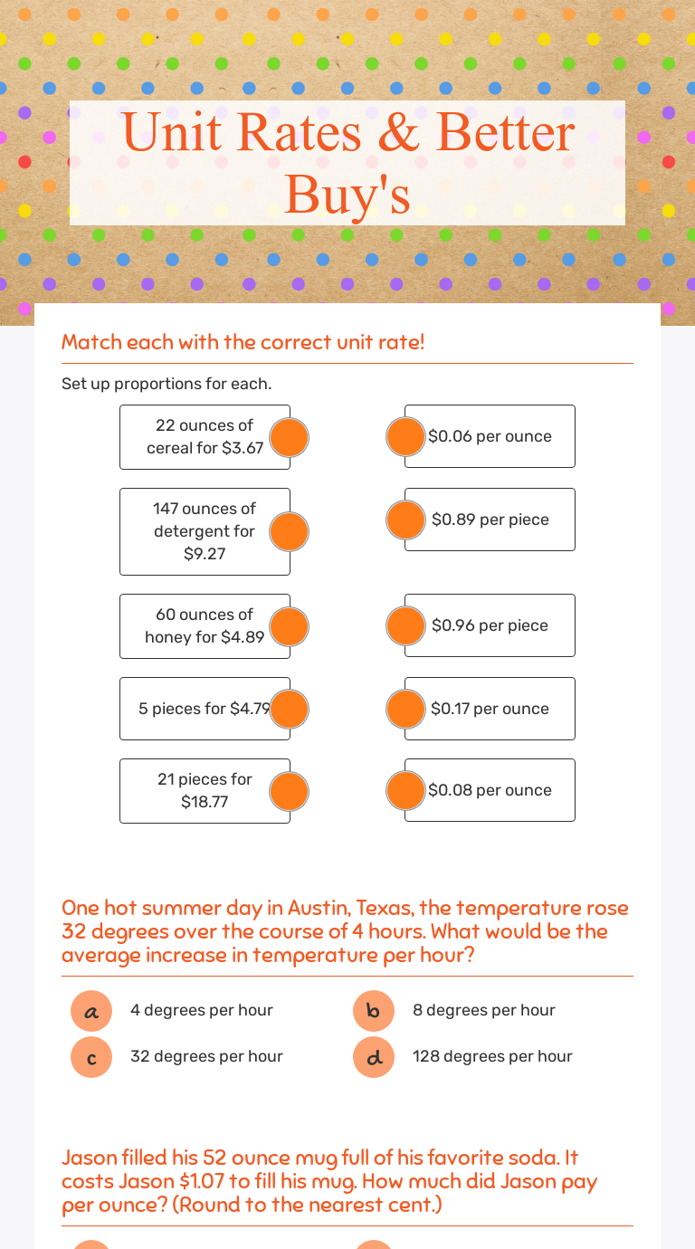Math Worksheet #1 ... for 20 ounces. a. Find the unit price for each. b. Assuming both brands taste equally good, which is the better buy, and why?