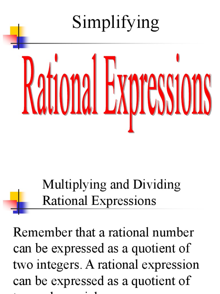 All worksheets Only my followed users Only my favourite worksheets Only my own worksheets. ID: 1570508 Language: English School subject: Math Grade/level: Gr11 Age: 10-12 Main content: Multiplying and Dividing Rational Expressions: Simplifying Rational Expressions Other contents...