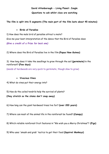 1. $1.49. Word Document File. This movie guide includes 3 instructional resources for use with the video "Planet Earth II: Jungles". You are purchasing a 26 question worksheet, a word search with 43 words from the movie, and a word jumble with 43 words from the movie. A word bank is included.