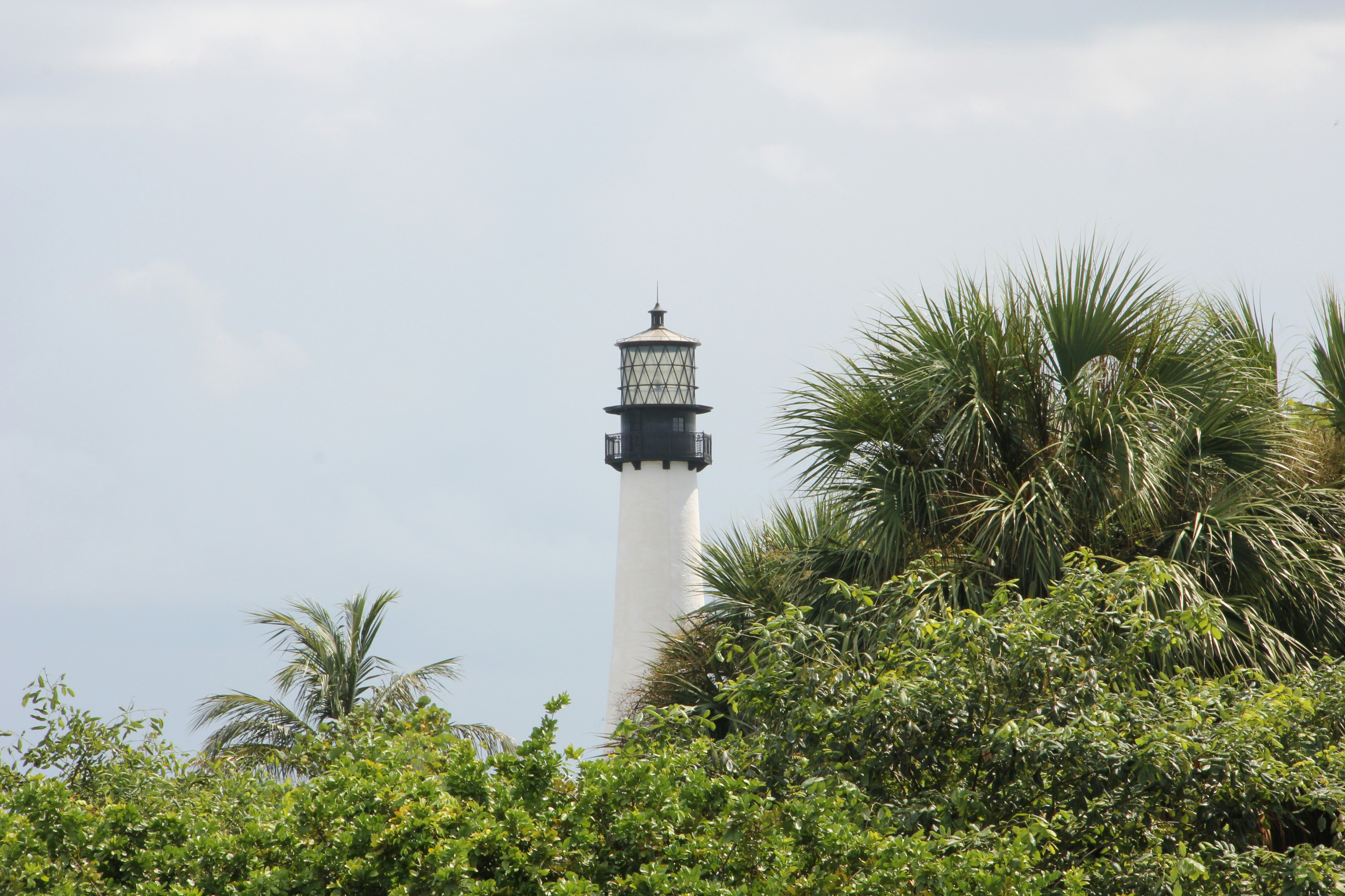 white and black lighthouse surrounded by green trees under white sky during daytime