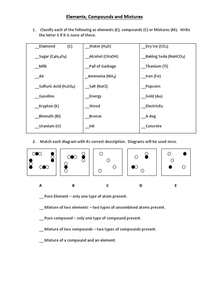 Elements compounds mixtures worksheet answers Worksheets are a working mixture of answers to the main elements of the mixture and mixture of compounds and review solutions for key classification tests of grade 7 science units 3 mixtures and solutions all small things unit 1 lesson 4 pure ingredients and a mixture of work mixtures.