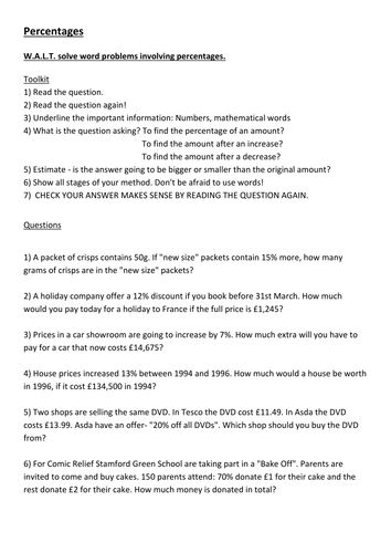 We have equation worksheets that cover absolute values, proportions, and percent problems. We have several word problem in this section such as one and two step equations, "distance, rate, and time" problems, mixture problems, and work word problems. These Equations Worksheets are a good resource for students in the 7th Grade through the 10th ... Percent of Increase or Decrease: with Word Problems. Based on the original amount, find the ratio of change in quantity. Then, calculate the percentage of increase or decrease. Each worksheet includes a number of word problems suitable for 7th grade and 8th grade students.