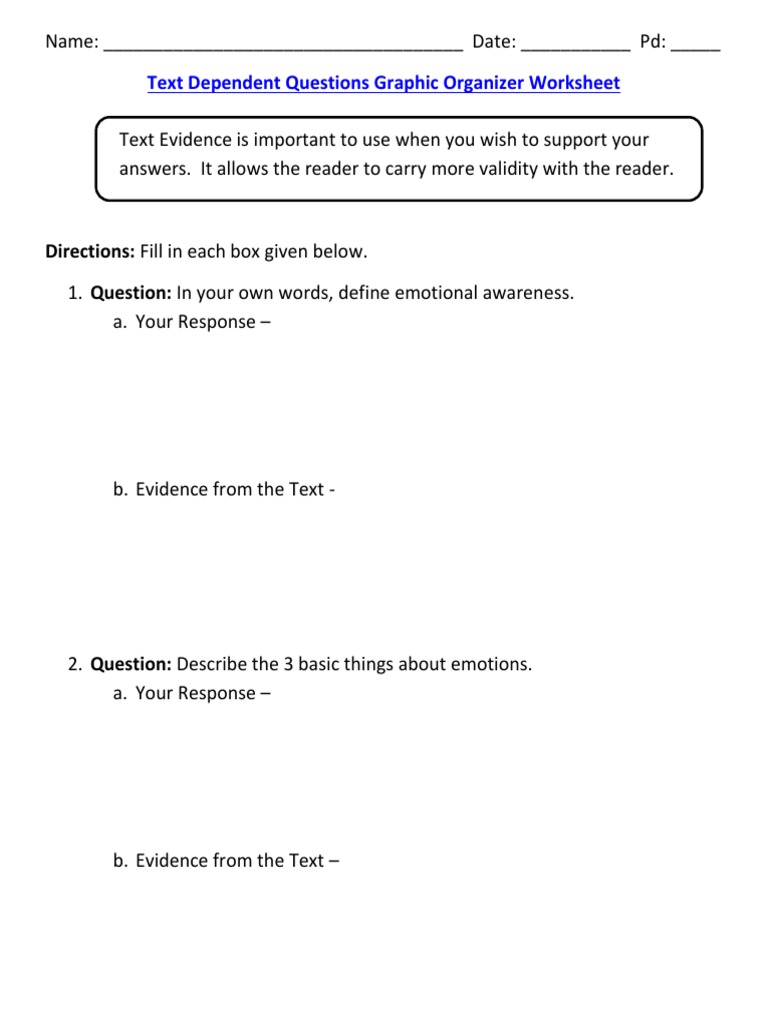require text‐dependent analysis; accordingly, aligned curriculum materials should have a similar percentage of text‐dependent questions. As the name suggests, a text‐dependent question specifically asks a question that can only be answered by referring explicitly back to the text being read. It does not rely on any particular background Text dependent question worksheet. Differentiated text dependent analysis tda practice this product includes 3 non fiction passages on 2 different levels. These are text dependent questions to use with texts for close reading. The questions come in bookmark format full page format and digital on google slides. Text name author.
