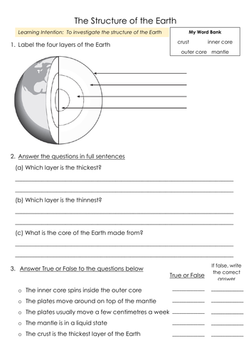 The Structure And Layers Of The Earth Labelling Worksheets. Structure Of The Earth Worksheet. The Structure And Layers Of The Earth Labelling Worksheets. Free Layers Of The Earth printable Science worksheets for 3rd Grade students. Click on the image to view or download the PDF version. Know Your Planets: Venus. Scrambled Sentences: Bedtime Bugs.