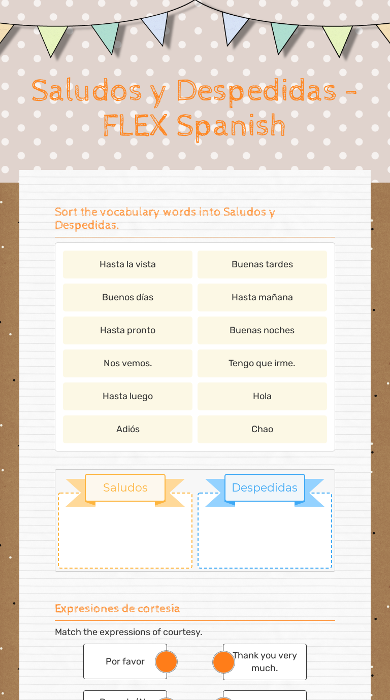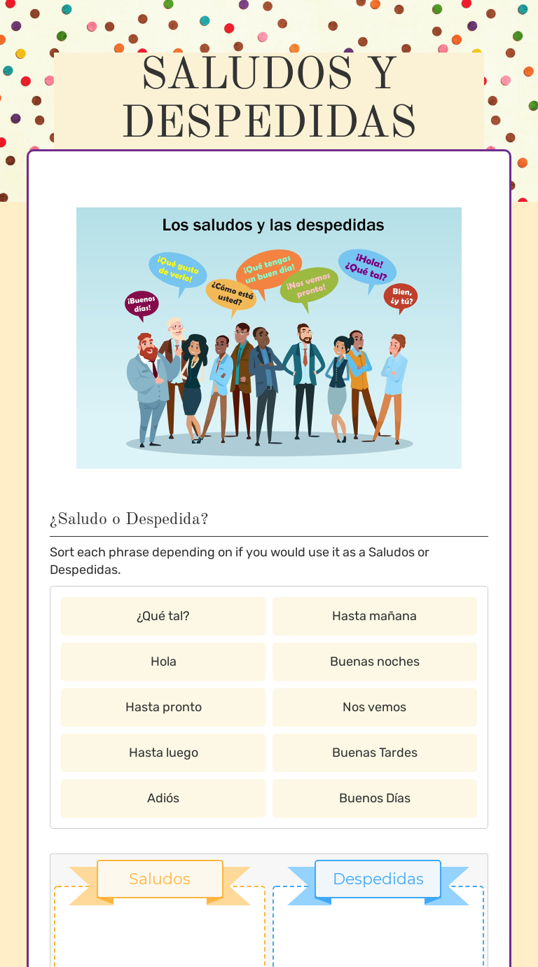 Saludos y despedidas worksheets and online exercises - live ... Saludos y despedidas worksheets and online activities. Free interactive exercises to practice online or download as pdf to print.
