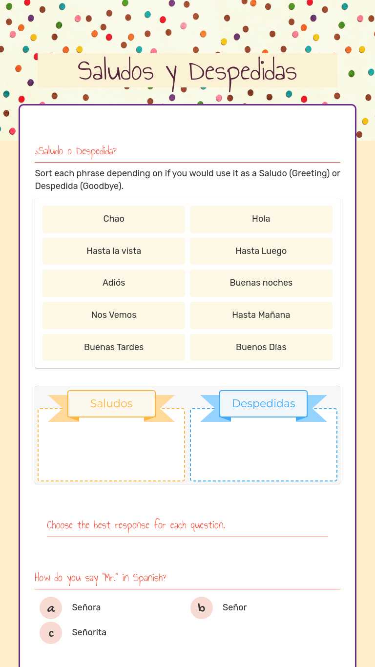 Repaso: Saludos y Despedidas | Interactive Worksheet by ... Repaso: Saludos y Despedidas Worksheet September 21, 2020 Impact. 21. 0. Languages - Spanish 10th Grade 11th Grade 12th Grade 6th Grade 7th Grade 8th Grade 9th Grade Weekly test Saludos y Despedidas. Ninfa Rodriguez 1.3K. 2 View Profile . Use this version, or check out other variations created by teachers from the Wizer community: ...