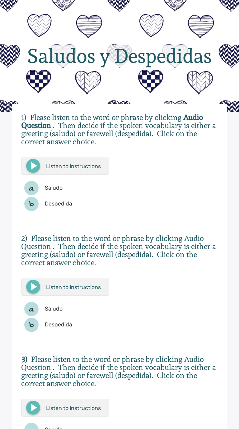 DOC UNIT 1: SALUDOS Y DESPEDIDAS - senorbell.weebly.com Unit One: Saludos y Despedidas. Practice Test. Objective 1: Interpretive Listening: I can demonstrate understanding of everyday expressions. Context: You are very excited that you can now understand some Spanish. You overhear some people speaking Spanish in the grocery store and, because you have been studying greetings, farewells and ...