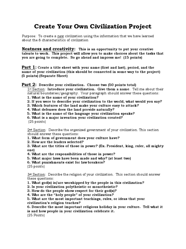 40 8 features of civilization worksheet - Worksheet Online Feb 02, 2022 · A civilisation is compiled of eight features. THEY ARE: 1. CITIES- man decides to stay in one place. 2. CENTRAL GOVERNMENT- ie. President, King, etc. 3. COMPLEX RELIGION- belief system. Usually has holy text. 4. JOB SPECIALISATION- everyone has their own job. Showing 8 worksheets for Eight Features Of Civilizations. 8 Features Of Civilization Worksheets & Teaching Resources | TpT This is a great lesson if you're looking for a discussion on the features of a civilization as a prelude to any civilization - Ancient Mesopotamia, Ancient Egypt, Ancient Greece etc... The 8 features discussed include: 1) Cities 2) Arts and Architecture 3) Public Works4) Central Governments5) PDF Eight features of civilization worksheet Civilization means: the phase of human social development and organization that is considered more advanced, and also defined as complex culture with five characteristics. These five features are: advanced cities, skilled workers, complex institutions, registration and advanced technology.