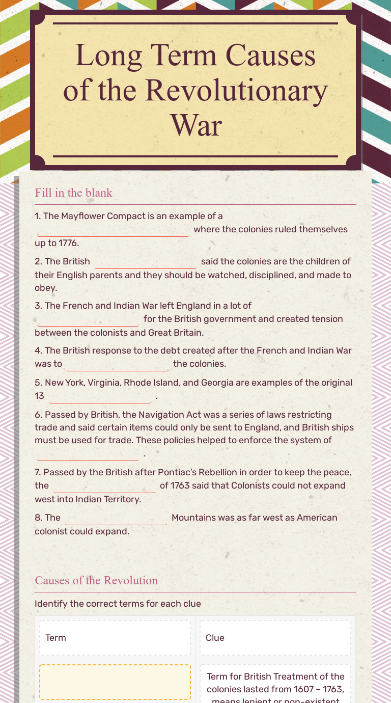 Causes Of The Revolutionary War Worksheet - Worksheet List Worksheets are causes of the american revolution overview causes of the american revolution focus on boston american revolutionary unit Uva stanley grade level. Causes of the revolutionary war. Either in partners or individually handout the attached worksheet americas growing...