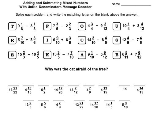 Add subtract mixed numbers worksheet. Adding Subtracting Fractions Worksheets Welcome to our Adding Subtracting Fractions Worksheets page. Here you will find a wide range of 5th Grade Fraction Worksheets which will help The sheets have been split into sections so that you can easily select the right one for your needs. Within each section the sheets get gradually harder... Adding and Subtracting Mixed Fractions (A) The Adding and Subtracting Mixed Fractions (A) Math Worksheet from the Fractions Worksheets Page at Math-Drills.com. Add Subtract Mixed Numbers Worksheets - Printable Worksheets Showing top 8 worksheets in the category - Add Subtract Mixed Numbers . Some of the worksheets displayed are Addsubtracting fractions and mixed numbers, Adding and subtracting mixed Once you find your worksheet, click on pop-out icon or print icon to worksheet to print or download. KS3 Fractions (Mixed, Improper, Add and Subtract ... Nov 04, 2014 · Probably best used with higher ability or adapting and expanding to suit lower ability Also included is a worksheet adding and subtracting, fractions, mixed numbers and some fractions with algebra for level 5, 6 and 7