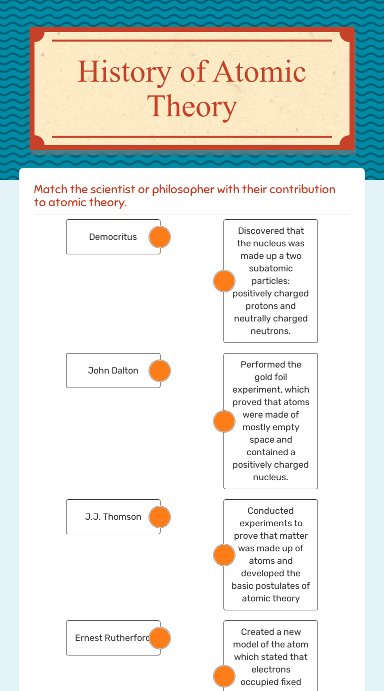 History of Atomic Theory - Worksheet | Easel Activity ... This worksheet contains basic conceptual questions about the History of Atomic Theory. You can access the answer key, also a word document and Google Slides link of this content from the following resource: History of Atomic Theory - Worksheet. Related products include: Atoms and Atomic Structure - Worksheet. Atoms, Molecules, and Ions - Worksheet