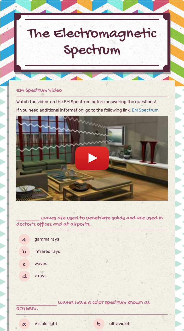 Electromagnetic spectrum worksheet.pdf - SCIENCE 8 u2013... Electromagnetic spectrum worksheet.pdf - SCIENCE 8 \u2013 ELECTROMAGNETIC SPECTRUM WORKSHEET NAME Meaghan Etienne S CIENCE 8 - E LECTROMAGNETIC S PECTRUM W ORKSHEET N AME : Meaghan Etienne Vocabulary Electromagnetic radiation Gamma rays Radiant... Science 8 - electromagnetic spectrum worksheet Worksheet for Physics Class. science electromagnetic spectrum worksheet name: vocabulary electromagnetic radiation electromagnetic spectrum frequency gamma rays. Preview text. Science 8 - electromagnetic spectrum worksheet. Name