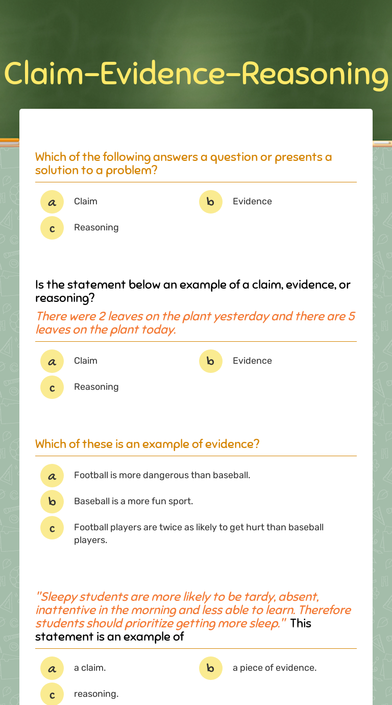 Designing Science Inquiry: Claim + Evidence + Reasoning ... 25.09.2012 · Designing Science Inquiry: Claim + Evidence + Reasoning = Explanation. The Claim, Evidence, Reasoning framework is a scaffolded way to teach the scientific method. By Eric Brunsell. September 25, 2012. In an interview with students, MIT’s Kerry Emmanuel said, “At the end of the day, it’s just raw curiosity. I think almost everybody that gets seriously into …