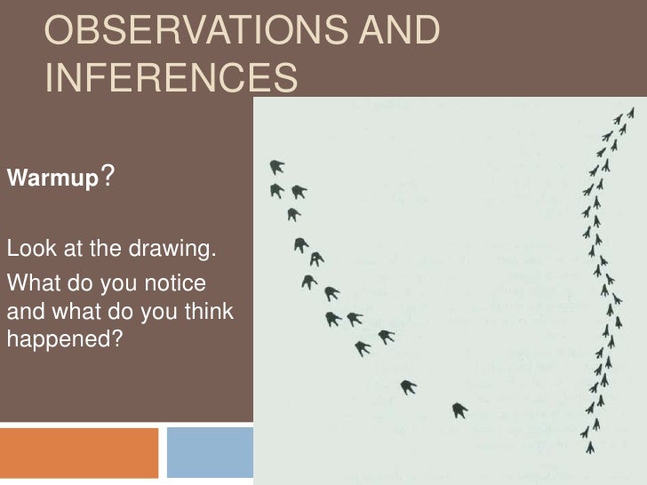 PDF Observation vs. Inference - Natural History Museum of Utah to understand that an observation is something that can be easily seen whereas an inference is a guess or idea that needs to be supported by evidence. For example, students can make the observation that a gecko has four short, skinny legs.