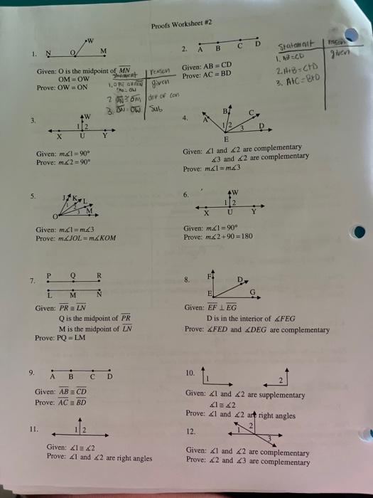 PDF Angle Proofs Worksheet Answers - Unbound Angle Proofs Worksheet Answers 1. Given: bisects -NDH Prove: -1 -3 Statements Reasons 1. 1. Given 2. 2. If a ray bisects an angle, then it divides the angle into 2 congruent angles. 3. 3. Vertical angles are congruent. 4. 4. Transitive Property 2. Given: -1 @ -2 Prove: -1 @ -3 Statements Reasons 1. 1. Given 2. 2. PDF Worksheet - Section 2-8 Proving Angle Relationships Worksheet - Section 2-8 Proving Angle Relationships Objectives: ... The following theorems hold true for angles and can be used in proofs dealing with angles Congruent Supplements Theorem Angles supplement to the same angle or congruent angles are congruent. Congruent Compliments Angle Proof Worksheet 1 Answer Key Free Printable ... Angle proof worksheet 1 answer key. proof logic unit 2 proof logic 5 segment and angle proofs note assig free math help high school math lessons inductive reasoning geometry . wilson 2012 pdf gina wilson all things algebra 2015 answers unit. angle proofs worksheet gina wilson. proofs worksheet 1 on a separate paper write a two column proof for. Math B Assignments: Introduction to Proofs If two angles are supplementary (or complementary) to the same angle, they are congruent. Vertical angles are congruent. If two supplementary angles are congruent, they are both right angles. How to: Draw simple conclusions from givens. Write a complete proof from givens to the desired conclusion Geometry: Intro Proofs Answers. HW IGP - 1. 2.