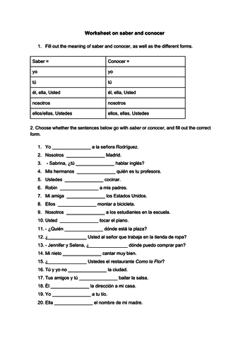 Saber vs conocer fill in the blank worksheet Saber vs conocer fill in the blank worksheet. Verbs -to know- online worksheet for high school level 1 or 2. You can do the exercises online or download the worksheet as pdf. Advanced search. x. Advanced search. Content: L ...