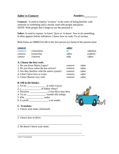 Spanish Saber Vs. Conocer Worksheets & Teaching Resources ... This is a worksheet that has students define the differences between the uses of Saber and Conocer, and correctly choose which to use and conjugate in a conversation about travel. The conversation is a conversation between a travel agent and a couple wanting to travel, and uses mostly traveling voc Saber vs Conocer Worksheet | Teaching Resources Saber vs Conocer Worksheet. Subject: Languages. Age range: 14 - 16. Resource type: Worksheet/Activity (no rating) 0 reviews. Language Resources by Nina. 4.666863905325444 202 reviews. Full time teacher since 2003. I specialize in fun readings and worksheets. Last updated. 8 November 2019. Share this.