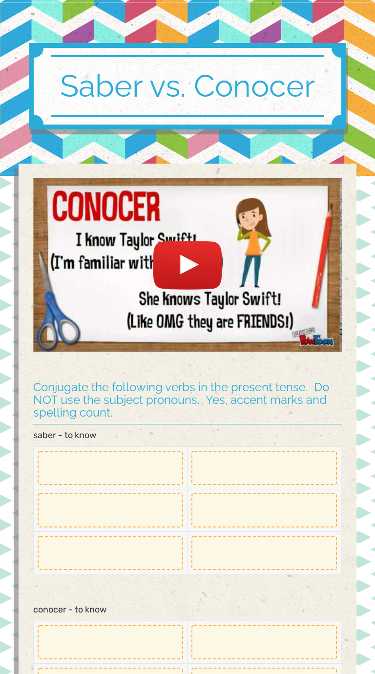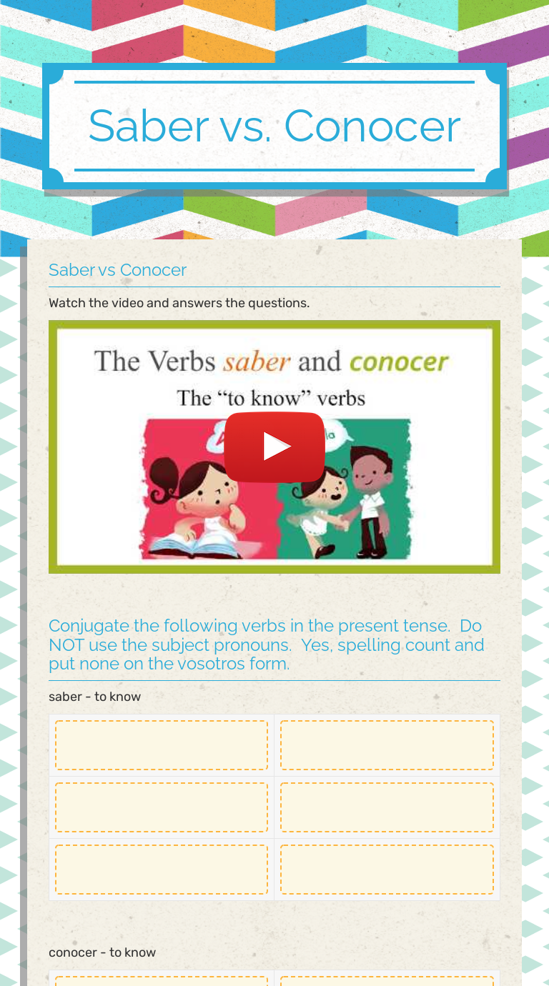saber vs Conocer | Interactive Worksheet by Erika Amador ... Wizer.me free interactive worksheet - saber vs Conocer by teacher Erika Amador. Pricing Schools About Log in Join now. Go Back. saber vs Conocer Worksheet September 28, 2017 Impact. 0. 1. Erika Amador 79.1K. 55 View Profile . Use this version, or check out other variations created by teachers from the Wizer community: ...