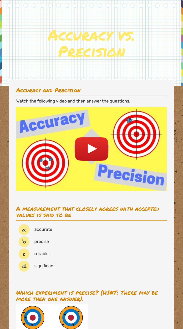 Accuracy and Precision interactive worksheet ID: 2211034 Language: English School subject: Chemistry Grade/level: 10, 11 Age: 15-18 Main content: Accuracy and Precision Other contents: Add to my workbooks (3) Download file pdf Add to Google Classroom Add to Microsoft Teams