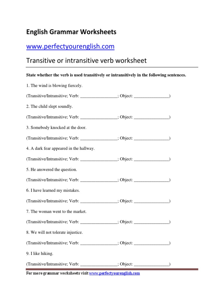 Transitive and intransitive verbs exercises pdf - Canada ... Worksheet For Transitive and Intransitive Verbs. A worksheet is one of the best way to learn to recognize transitive and intransitive verbs. Nevertheless, it is important to note these three tips in recognizing transitive and intransitive verbs. Transitive Or Intransitive Verb Exercise englishgrammar.org
