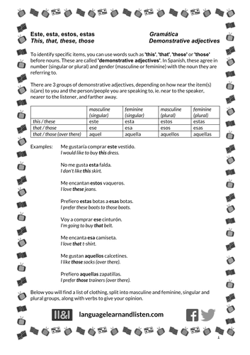 Demonstrative Adjectives Spanish Worksheet - Diy Color Burst Spanish Demonstrative Adjectives Worksheet Adjective Worksheet Adjectives Worksheets. Students can work together to construct sentences utilizing their clothing vocabulary. Ad Download over 20000 K-8 worksheets covering math reading social studies and more. This that these those pdf. Download and complete the attached worksheet.
