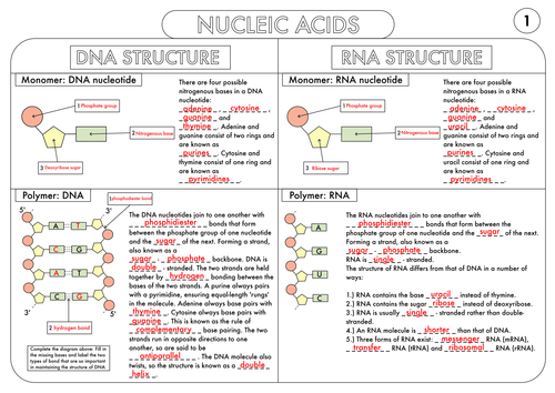 Structure and function of nucleic acids The basic information for all activities in living systems, at least on our planet, is stored ultimately in nucleic acids, namely, deoxyribonucleic (DNA) 1). The chemical structures of basic units of RNA and DNA have been elucidated, and both types of nucleic acids are linear polymers of monomeric... 3.5: Nucleic Acids - Biology LibreTexts | Answer Nucleic acids are the most important macromolecules for the continuity of life. They carry the genetic blueprint of a cell and carry instructions for The two main types of nucleic acids are deoxyribonucleic acid (DNA) and ribonucleic acid (RNA). DNA is the genetic material found in all living organisms... STRUCTURES OF NUCLEIC ACIDS - PDF Free Download Proteins and Nucleic Acids Chapter 5 Macromolecules: Proteins Proteins Most structurally & functionally diverse group of biomolecules. : o Academic Nucleic Acids and Protein Synthesis Test Multiple Choice Identify the letter of the choice that best completes the statement or answers the... Worksheets With Answers | PDF | Plasmid | Molecular Cloning Worksheets With Answers - Free download as Word Doc (.doc), PDF File (.pdf), Text File (.txt) or Antibody binding, a technique similar to nucleic acid hybridization, identifies the clone containing the b. Medicine - Answers questions about gene function. Makes human proteins for treating diseases...