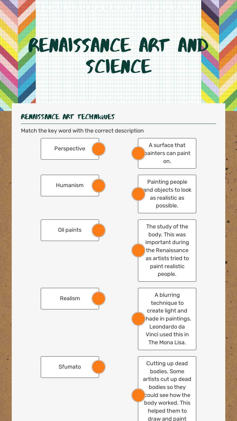 Art and artist of the renaissance worksheet. Renaissance worksheets and online exercises Renaissance worksheets and online activities. Free interactive exercises to practice online or download as pdf to print. All worksheets Only my followed users Only my favourite worksheets Only my own worksheets. Browse Printable Art History Worksheets | Education.com Students gain familiarity with some of the great artists from Renaissance Italy in this engaging art-centered social studies worksheet! Discover an ancient language spoken through art! Interpret an image from ancient Egyptian art and then create one of your own with this history sheet. The Characteristics of Renaissance Art are So Very... - Art Hearty Art works of the Renaissance period are exemplary of the creative genius that existed in that era. These works have had numerous interpretations over the centuries, but everyone agrees that some characteristics remain synonymous with the period. Why commission artwork during the renaissance? - Smarthistory At Smarthistory, the Center for Public Art History, we believe art has the power to transform lives and to build understanding across cultures. We created Smarthistory to provide students around the world with the highest-quality educational resources for art and cultural heritage—for free.