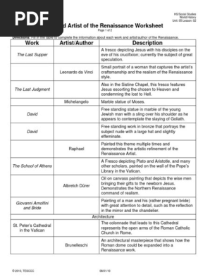 Art and Artist of The Renaissance Worksheet | PDF | Michelangelo Work Artist/Author Description A fresco depicting Jesus with his disciples on the The Last Supper eve of his crucifixion; currently the subject of great speculation. © 2010, TESCCC 08/01/10. HS/Social Studies World History Unit: 05 Lesson: 02. Art and Artist of the Renaissance Worksheet.