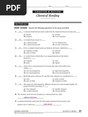 Chapter 6 chemical bonding worksheet answer key CHAPTER 6 Chemical binding SECTION 1 Introduction to chemical binding dimensions 1. Define chemical binding. 2. Explain why most atoms form chemical bonds.2 pages