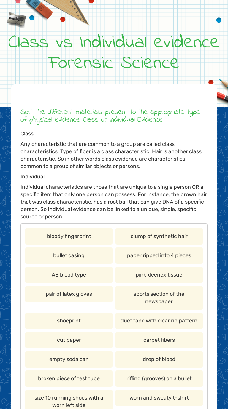 Hair fiber evidence worksheet answers. › Pages › classforsciThe Science Spot Hairs & Fibers (PPT) - I use this presentation to introduce the use of hairs and fibers as evidence. This unit includes an "up close" look at hairs and fibers using microscopes and an assortment of prepared slides. At the end of the lesson, I have students complete the Hair & Fiber Challenge to test their ability to identify various samples. › trace › TraceEvidenceA Simplified Guide To Trace Evidence Introduction At!a!crime!scene,!there!are!often!tiny!fragments!of!physical!evidence!such!as! hairs,!fibers!from!clothing!or!carpeting,!or!pieces!of!glass!that!canhelp ... PDF Hair & Fiber Challenge - Science Spot the Hair & Fiber ID Lab. I used a microscope camera to capture images of the samples they had to use for the lab. The images were taken at 100X and 400X magnifications. I printed copies of the hair and fiber samples (pages 1 and 2) as well as enough copies of the answer sheet (page 3) for each group. Unit 2 - Hair and Fibers - Forensic Science - Mrs. Merrill Unit 1 - Crime Scene and Evidence. Unit 2 - Hair and Fibers. Unit 2.5 - Handwriting and Document Analysis. Unit 3 - Criminal Law Background and Fingerprinting. Unit 4 - Tool Marks, Casts, and Impressions. Unit 5 - Death: Meaning, Manner, Mechanism, Cause and Time. Unit 6 - DNA.