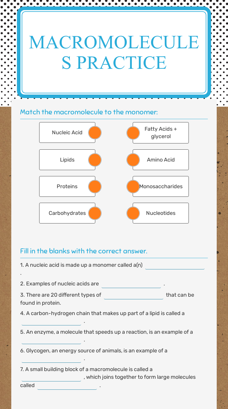 42 building monomers of macromolecules worksheet answers ... Answer Macromolecule Key Worksheet [J7WDF9] ESL Worksheets: Free printable worksheets for English as a Second Language students and teachers. organic molecules worksheet review answers, macromolecule worksheet answer key and carbohydrates worksheet answers are three of main things we will present to you based on the post title. Macromolecules Worksheet Answers - Worksheet Answer Key Macromolecules Worksheet Answers It's easy to do what we have actually set out to do. There are 9 sentences on each worksheet. Check out the sentences thoroughly after that identify the nouns for every paragraph. After properly determining as well as underscoring all of the words in the worksheets, his work is done. Macromolecules Worksheet Answers
