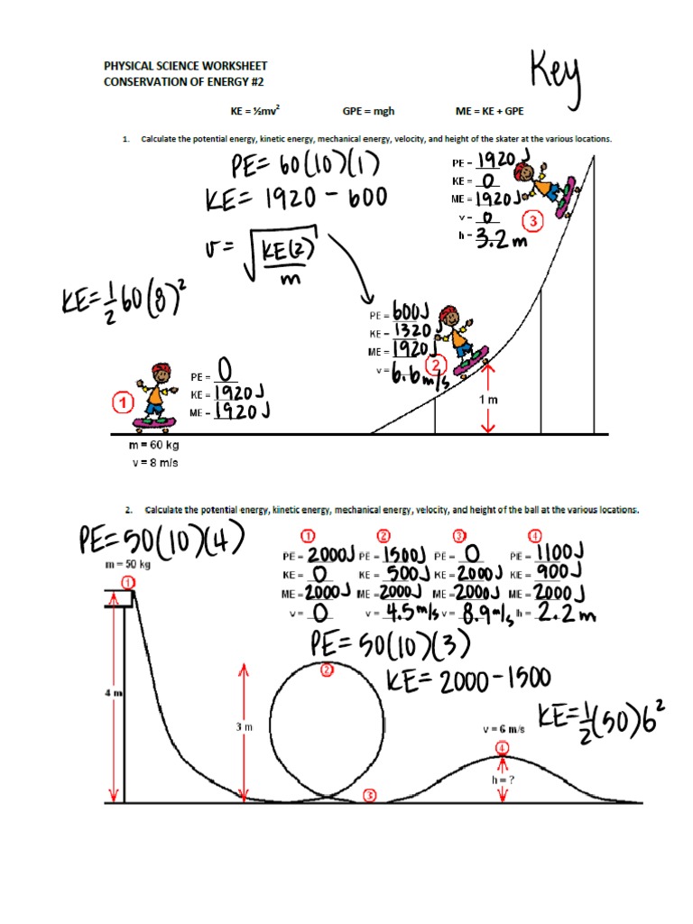 PDF Physical Science Worksheet Conservation of Energy #2 PHYSICAL SCIENCE WORKSHEET CONSERVATION OF ENERGY #2 KE = ½mv2GPE = mgh ME = KE + GPE 1. Calculate the potential energy, kinetic energy, mechanical energy, velocity, and height of the skater at the various locations. 2. Calculate the potential energy, kinetic energy, mechanical energy, velocity, and height of the ball at the various locations. 3.