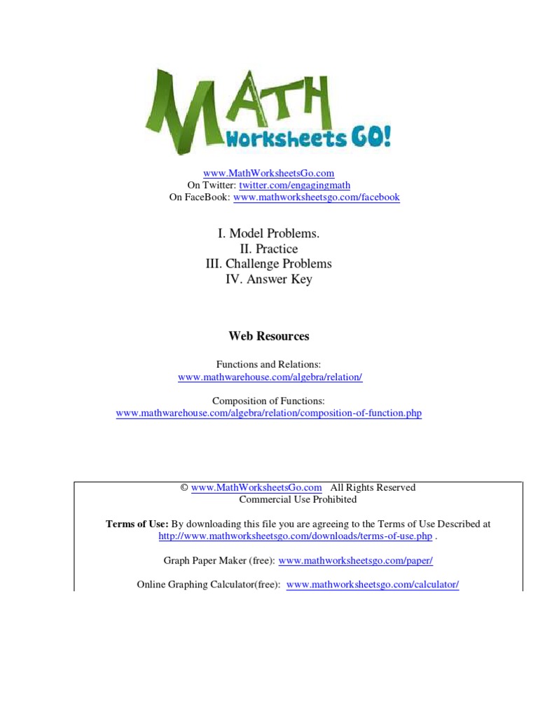 Algebra Function Worksheets (pdfs) with answer keys on ... Free printable Function worksheets (pdf) with answer keys on the domain/range, evaluating functions, composition of functions ,1 to 1 , and more. Please disable adblock in order to continue browsing our website.