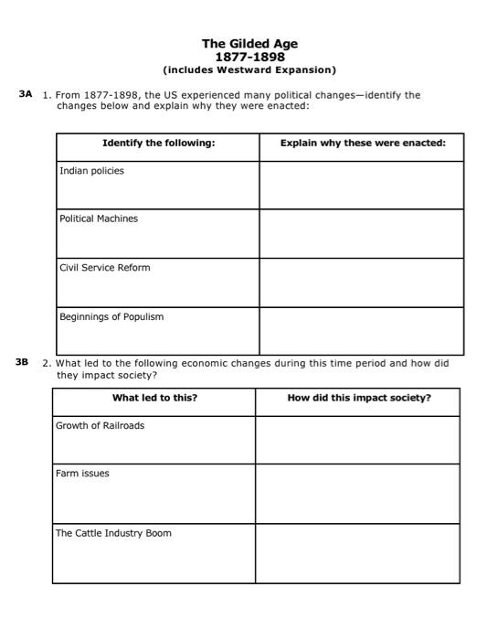 The gilded age worksheet answers. PDF The Gilded Age: Part 1 Part A: Short Answer: Instructions ... The era of the 1870s and 1890s is often referred to as the Gilded Age. 2. In the late 1800s, many factories had health hazards inside. 3. If an elected leader was illegally using his office for personal gain, that leader would practicing the immoral practice of graft. 4. DOC Unit I - National Park Service "What Have You Learned?" worksheet. Reading 1.1- The Gilded Age. The period of our Nation's history from the end of the Civil War to the close of the 19th century has been coined "The Gilded Age." Mark Twain and Dudley Warner first used this term in 1873 in their book, The Gilded Age: a Tale of Today. the gilded age worksheet answer key - WorksheetAnswers.co The Gilded Age Worksheet Answer Key January 25, 2022 · Polynomials The Gilded Age Worksheet Answer Key - "Fill in the Blank" worksheets, or "Closed Worksheets," are another time period for Cloze worksheets. The reader is tasked with filling in the blanks inside a created piece… Labor-In-The-Gilded-Age-Worksheet-Answers.pdf - Wright ... View Labor-In-The-Gilded-Age-Worksheet-Answers.pdf from ECON 545235 at Blanchard Hs. Wright State University CORE Scholar Gateway to Dayton Teaching American History: Citizenship, Creativity, and