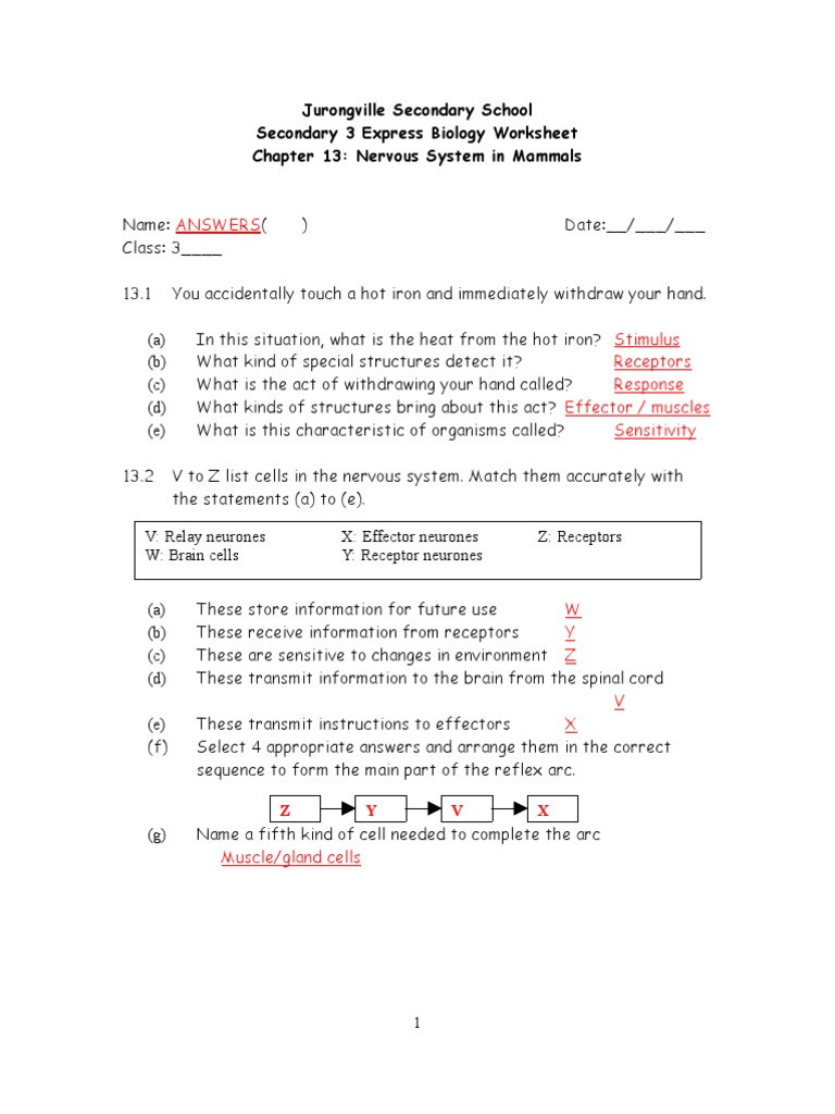 Chapter 13 Nervous System in Mammals - Worksheet (Answers) | Nervous System | Central Nervous System