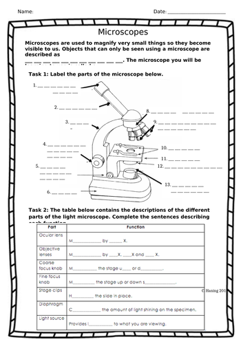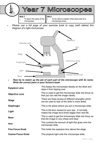 Parts of a Microscope Worksheet | Teaching Resources pdf, 246.88 KB pub, 119 KB This worksheet asks pupils to label the different parts of a microscope and then match up the keyterms with their function. This is a good resource to use alongside the first lesson on microscopes. I hope that you find this resource useful and that you will leave feedback if you are able to use it.