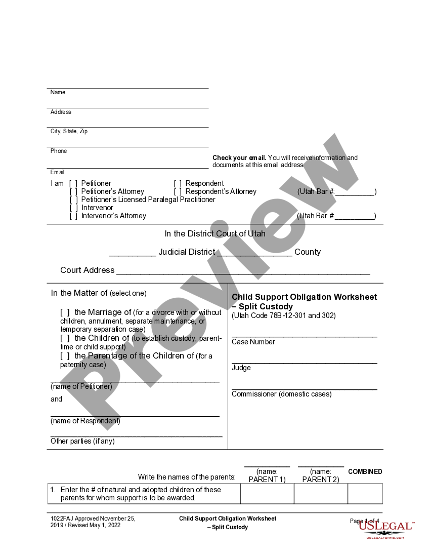 PDF Child Support Obligation Worksheet - Split Custody Child Support Obligation Worksheet - Split Custody Page 1 of 4 Name Address City, State, Zip Phone Check your email. You will receive information and ... Child Support Obligation Worksheet - Split Custody (Utah Code 78B-12-301 and 302) _____ Case Number _____ Judge _____ ...